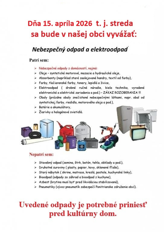 Dňa 15. apríla 2026 sa bude v našej obci vyvážať elektroodpad a nebezpečný odpad