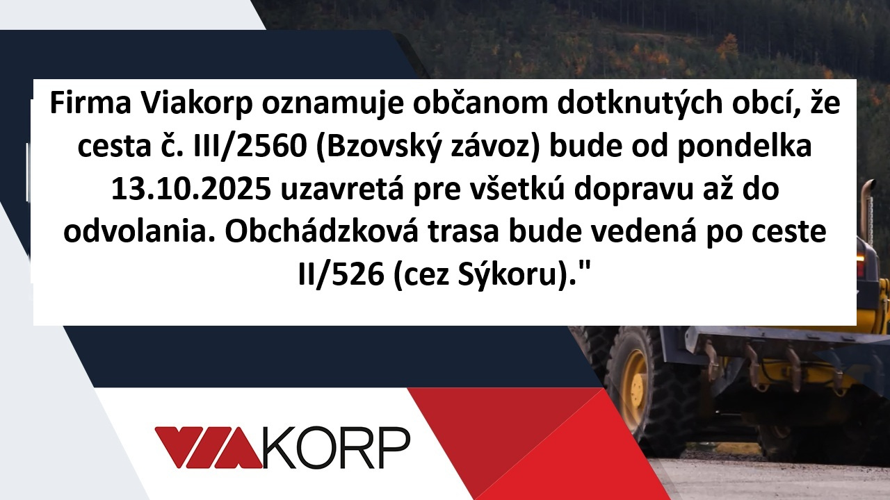 Firma Viakorp oznamuje občanom dotknutých obcí, že cesta č. III/2560 (Bzovský závoz) bude od pondelka 13.10.2025 uzavretá pre všetkú dopravu až do odvolania.