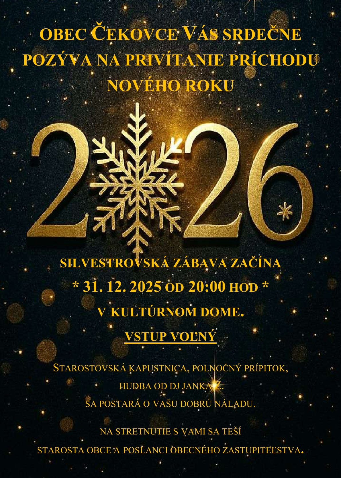 Obec Čekovce Vás srdečne pozýva na privítanie príchodu nového roku 2026