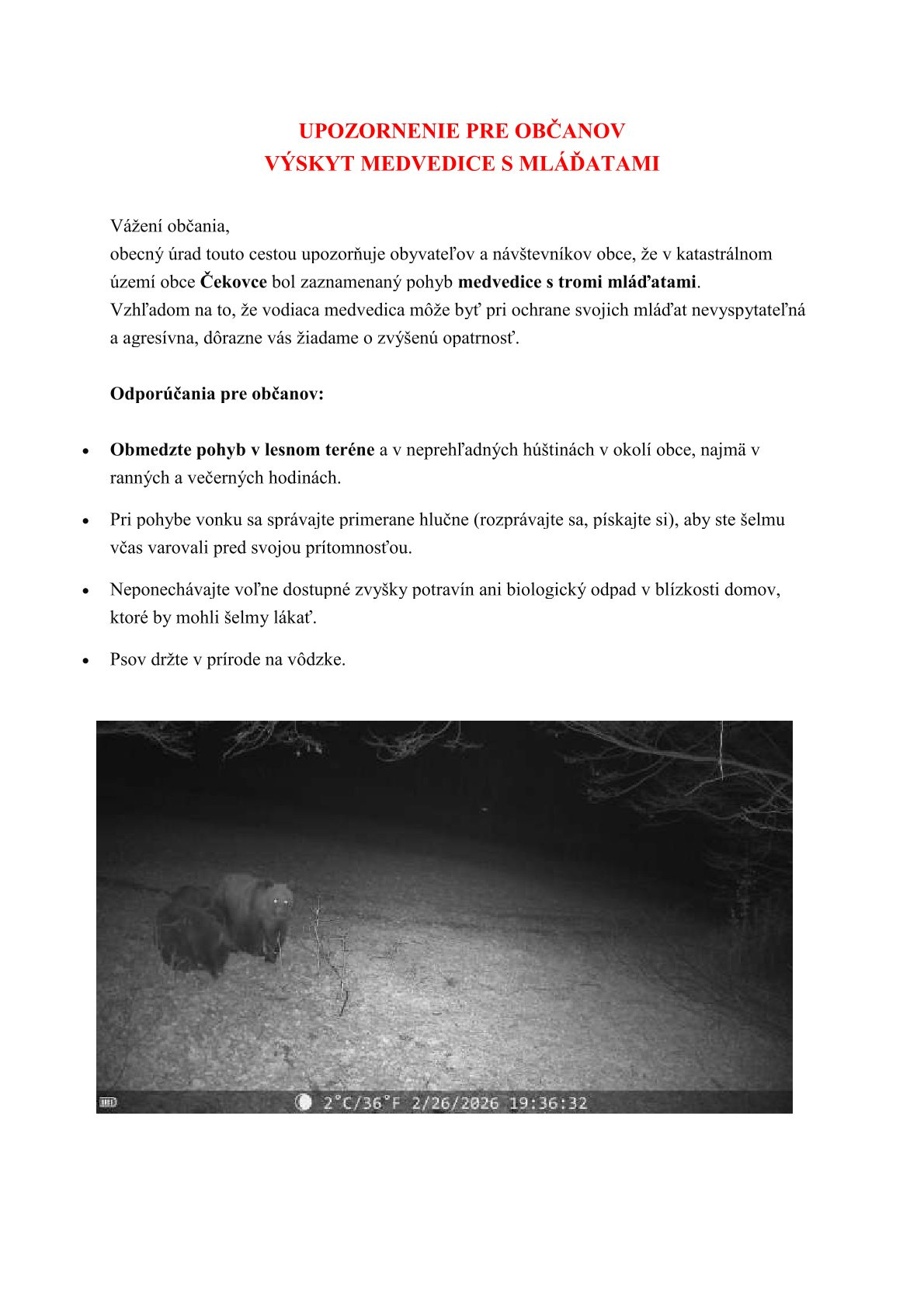 UPOZORNENIE PRE OBČANOV: VÝSKYT MEDVEDICE S MLÁĎATAMI