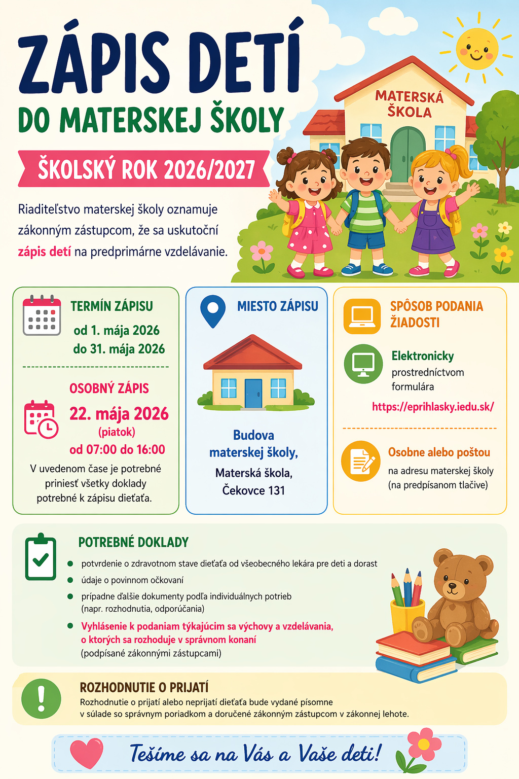 Riaditeľstvo materskej školy týmto oznamuje zákonným zástupcom detí, že v súlade s platnými právnymi predpismi Slovenskej republiky sa uskutoční zápis detí na predprimárne vzdelávanie pre školský rok 2026/2027.