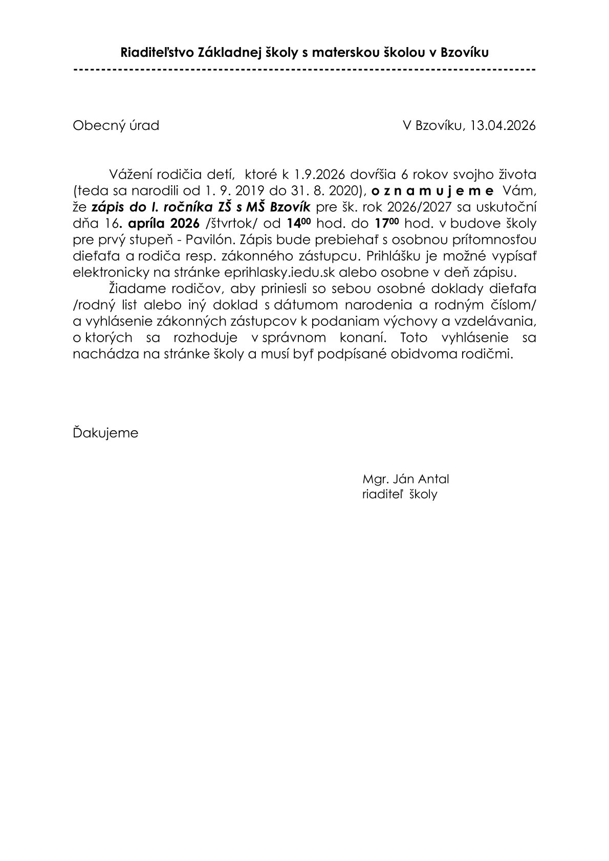 Zápis do 1. ročníka Základnej školy s materskou školou v Bzovíku